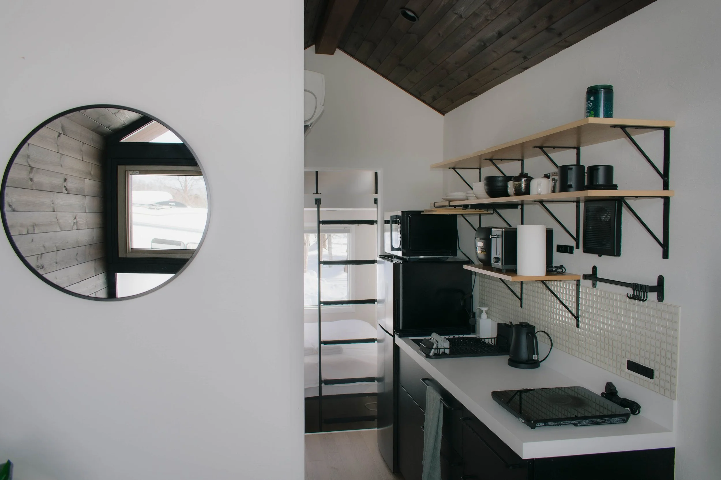 The kitchenette has a curated selection of quality kitchen appliances: Balmuda electric kettle, Tiger IH rice cooker, Lithon wide-slot pop-up toaster, Toshiba microwave, 118L fridge/freezer and portable induction stove.